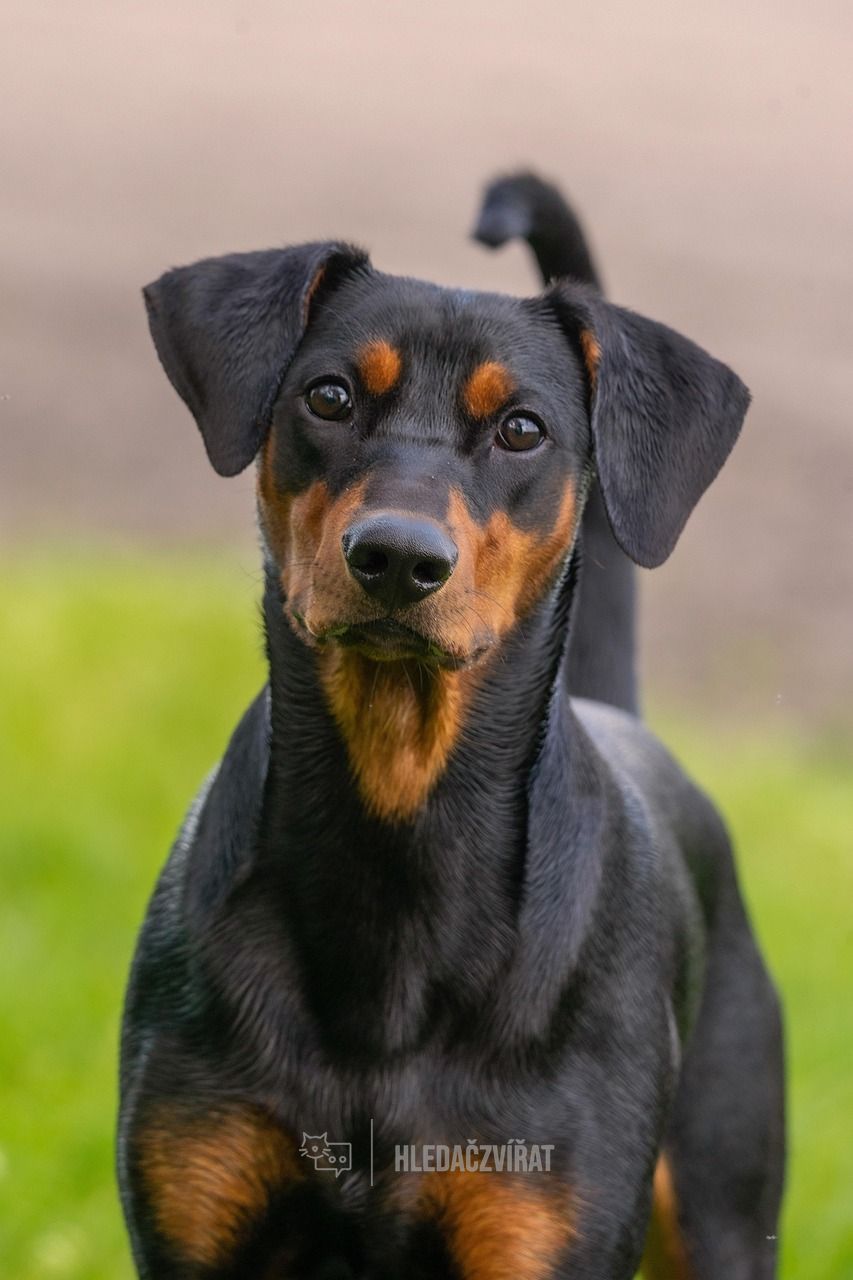 Má štíhlé a svalnaté tělo s hladkou a lesklou srstí. Má pravidelné rysy, výrazné oči a vztyčené uši, které dodávají jeho obličeji ostražitý vzhled. Srst je krátká a hladká na dotek. Barvy zahrnují černou s červenými znaky, celočervenou, červenou a modrou s červenými znaky.