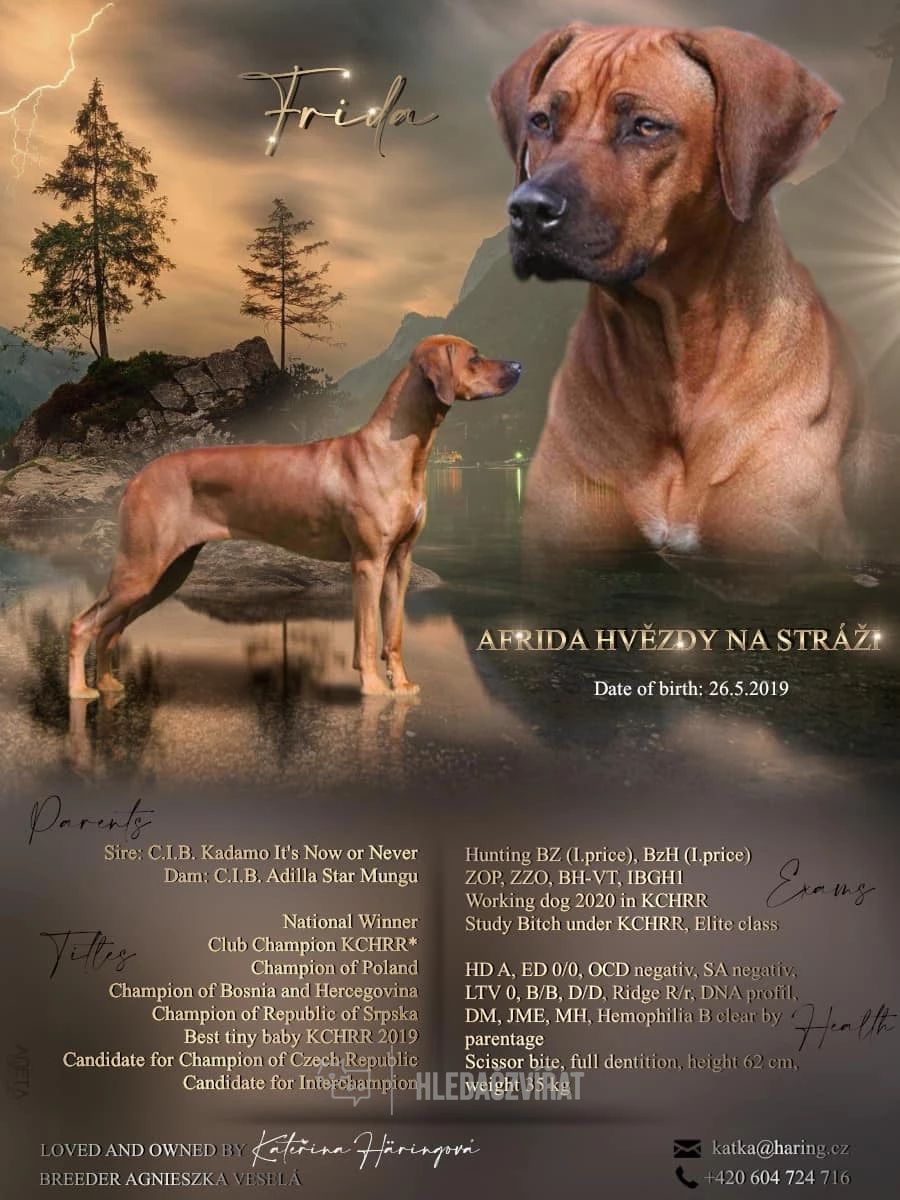 Frida, celým jménem Afrida Hvězdy na stráži, se narodila 26.5.2019 v chovatelské stanici Hvězdy na stráži jako šestá v pořadí (slečna meruňková) výstavně úspěšným rodičům, mamince Adilla Star Mungu a tatínkovi Kadamo It‘s Now or Never. Když se narodila, vážila 465g, byla nejmenší z celého vrhu. Ve vrhu bylo 7 štěnátek, 2 kluci a 5 holčiček, z toho jedna holčička nestandardní, která byla její velkou parťačkou. Jméno Afrida má africký původ, znamená štěstí, radost. Frida je velice nekonfliktní fena, s přátelskou povahou, miluje psy, lidi, pohyb. Je poslušná a velmi učenlivá, aktivita ji musí bavit.. a samozřejmě, pro dobrotu udělá cokoliv