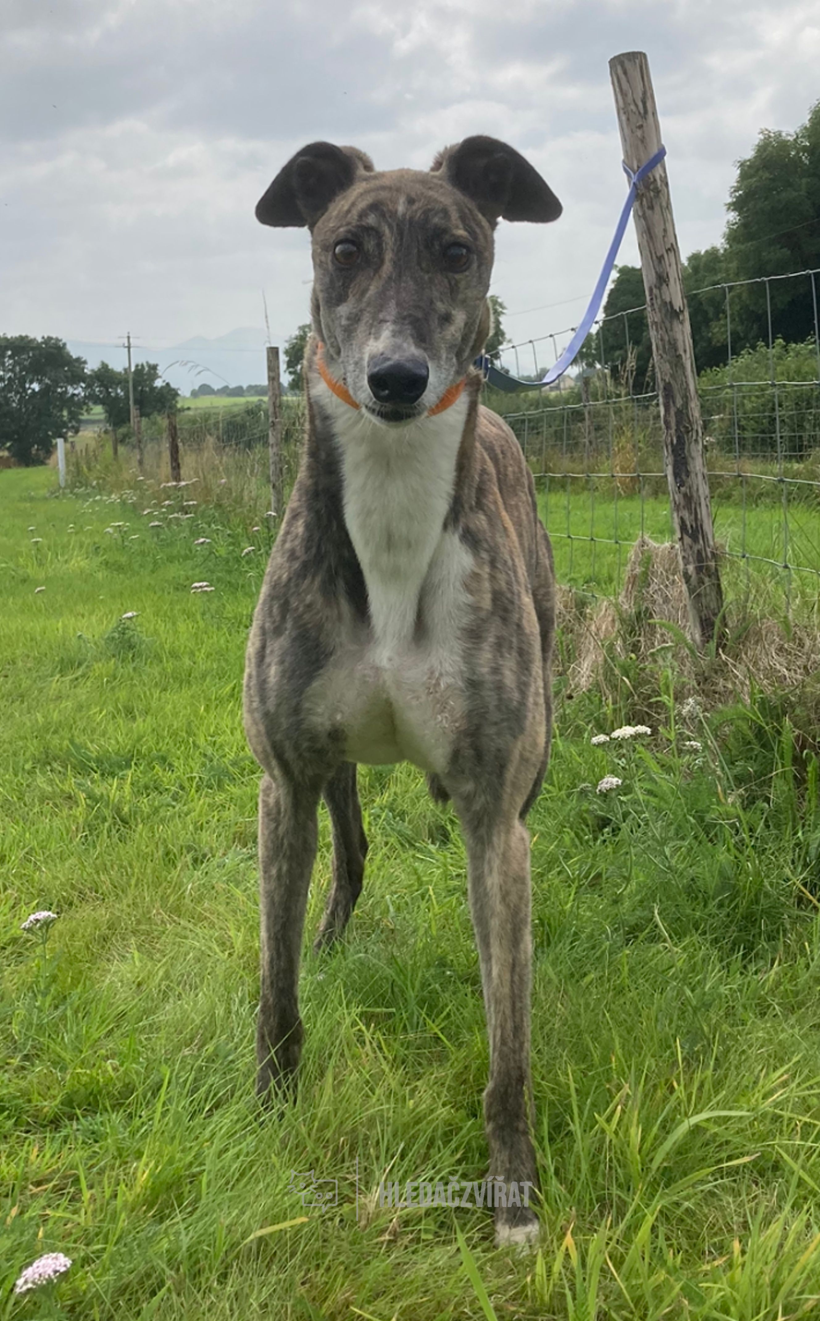 Lucky, přenádherný greyhound s bílou košilí a žíhaným frakem, hledá domov.