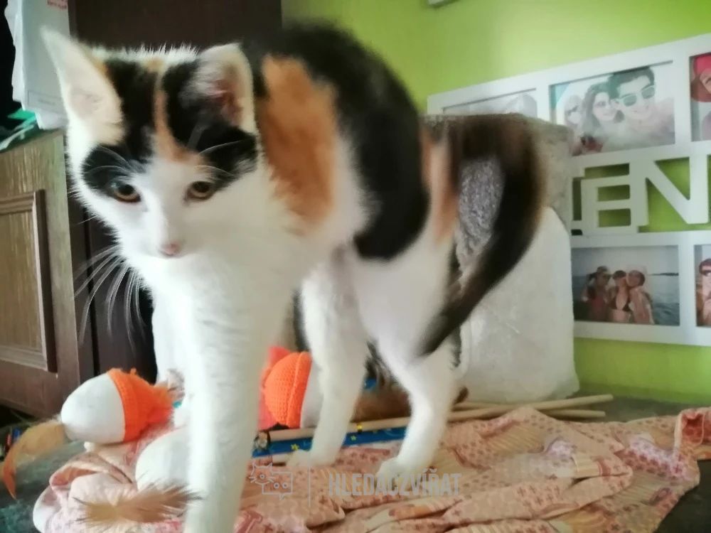 Přibližně roční kočka s tříbarevným kožíškem. Nalezená na hřbitově v Kunovicích, kde se potulovala po okolí a ne všem lidem to bylo příjemné a proto bylo v zájmu jejího dalšího přežití ji ubytovat u nás v depozitu.