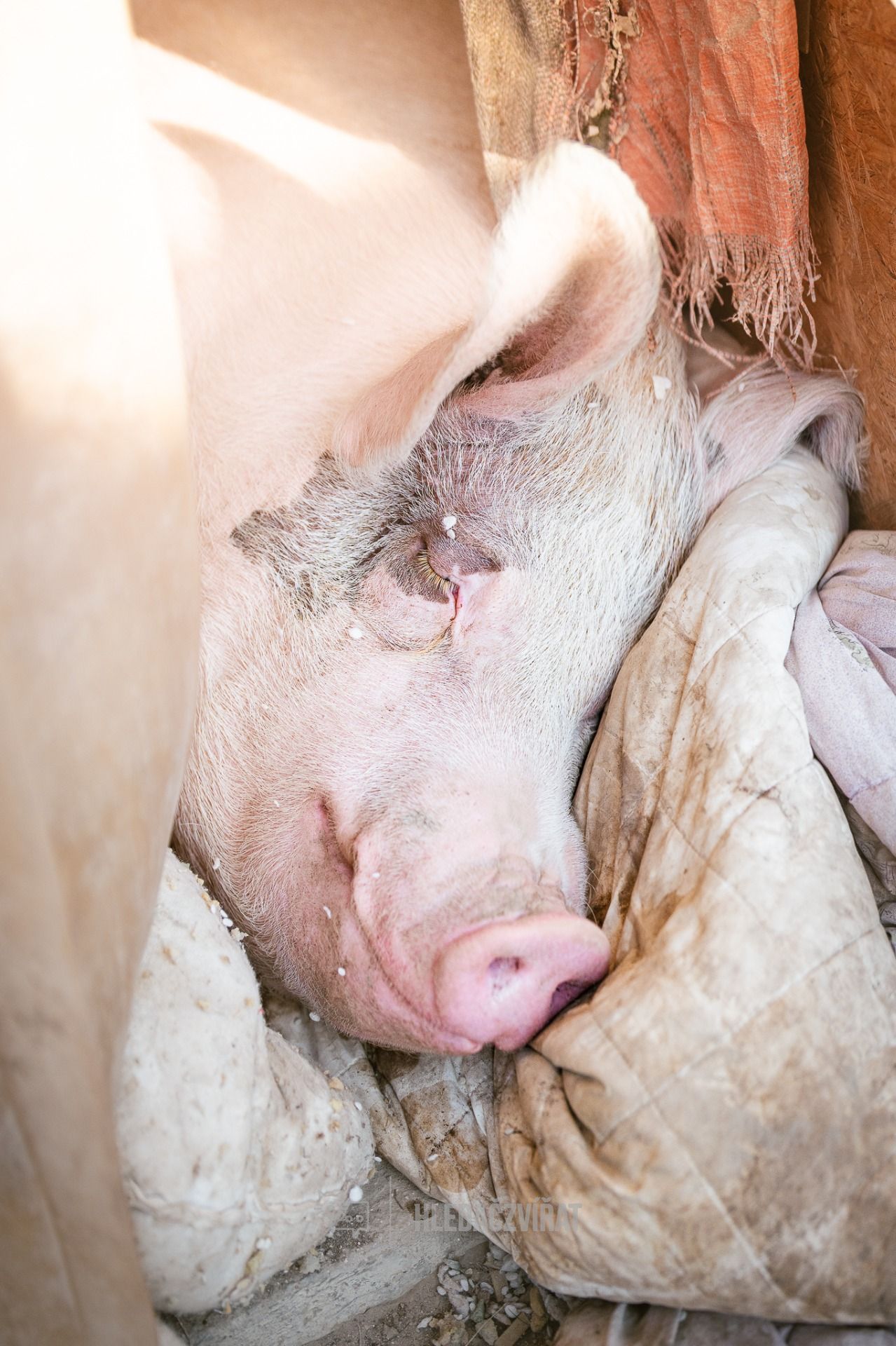 Betynka se narodila 5. 7. 2020 ve velkochovu a protože byla nemocná, měla skončit v kafilerii, jelikož ve velkochovech se z finančních důvodů neléčí... Když nás kontaktovali její zachránci, rozhodli jsme se pomoci, protože už jsme delší dobu zvažovali kamarádku pro vepříka Tondu, se kterým se ostatní zvířátka nebaví. Přijali jsme ji 7. 8. 2020 a ve chvíli příjmu měla 2,7 kg a 48 hodin života... Měla totiž vážit 6kg a nebyla na tom vůbec dobře. Nejedla, měla infekci v kloubech...
