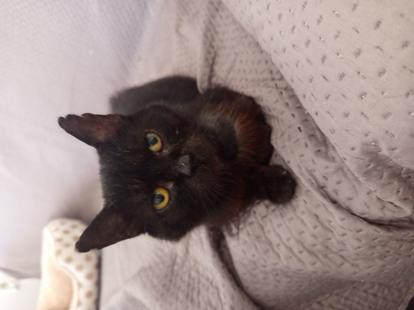 Nyní je velmi mazlivý, hodný, nechá se i chovat a krásně přede, jen se stále krčí dokud nevidí, že mu nikdo neublíží.