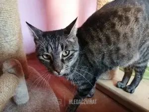 Z malého kocourka vyrostl krásný velký kocour. Je to mourované vděčné zlatíčko, které touží po pohlazení. Přiblíží se hned, když se někdo objeví v pokoji, aby na sebe upozornil. Je bezproblémový k ostatním kočkám. Je kastrovaný, očkovaný, očipovaný, testovaný, FeLV a FIV negativní. Narozen cca 05/2017.