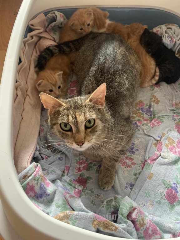 Terezka je z Vršovic z odchytové lokality a krmného místa. Dostala se k nám už s obr bříškem a tak u nás odchová svá poslední koťata. A má jich hned pět. Terezka je hodná, mazlivá, ale své děti si chrání jako lvice.