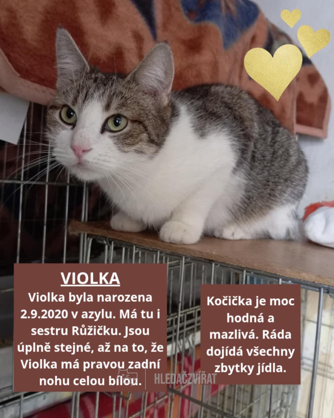Má tu i svou sestru Růžičku. Jsou úplně stejné, jen Violka má celou bílou pravou zadní nohu.