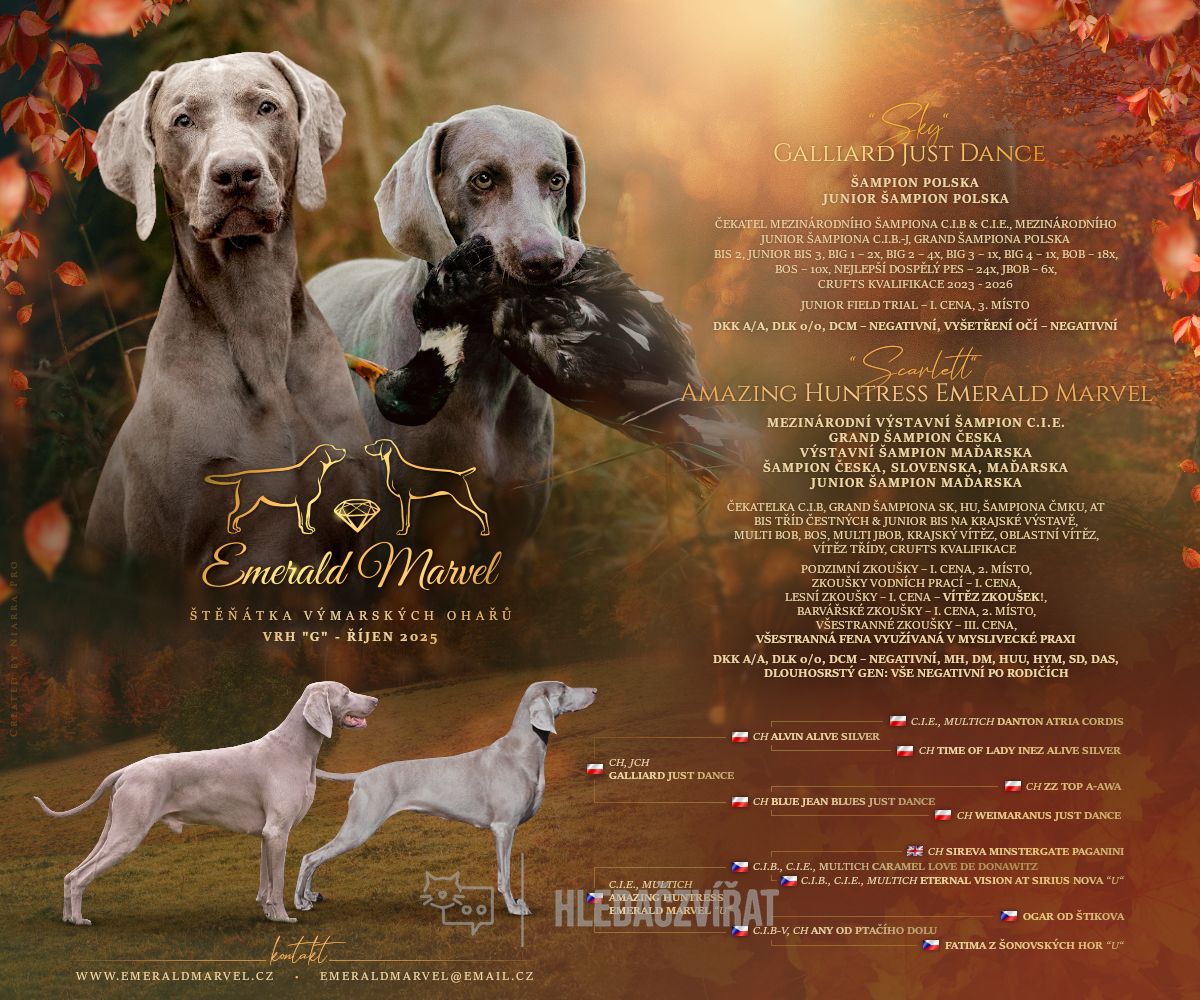 Chovatelská stanice EMERALD MARVEL (registrovaná pod FCI) přijímá rezervace na náš podzimní vrh štěňátek výmarských ohařů krátkosrstých. Štěňátka se narodí koncem října, odběr v polovině prosince. Štěňátka budou vhodná na výstavy, práci, sport, ale i jako rodinní společníci.